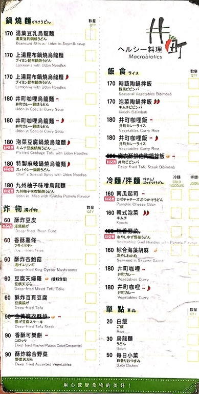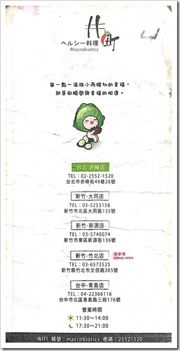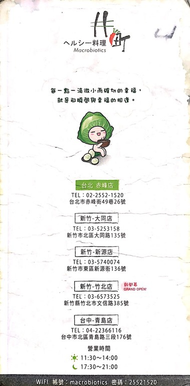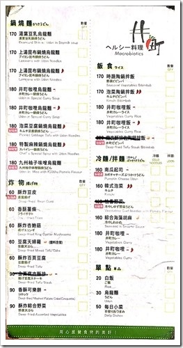 菜單上會標明辣度以及有無蛋奶成分的餐點。菜單背面還有其他分店資訊,新竹和台中都有點。